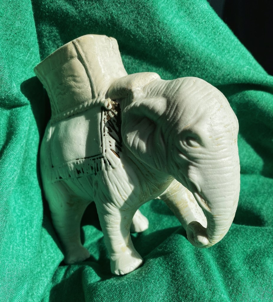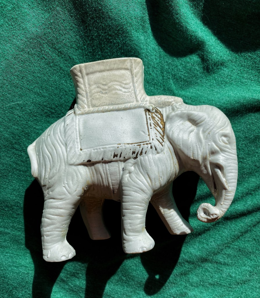 My mom spoke so kindly about an elderly woman who lived next-door to them in the north end. She didn’t have much from what my mom said, but she chose to give mom one of her most treasured possessions, the White Elephant. The woman had been given the White Elephant by her mother when she was just a child. It has no other information, so I have no idea how old it is, where it was originally made, etc. All I knew was that my mother loved it.
