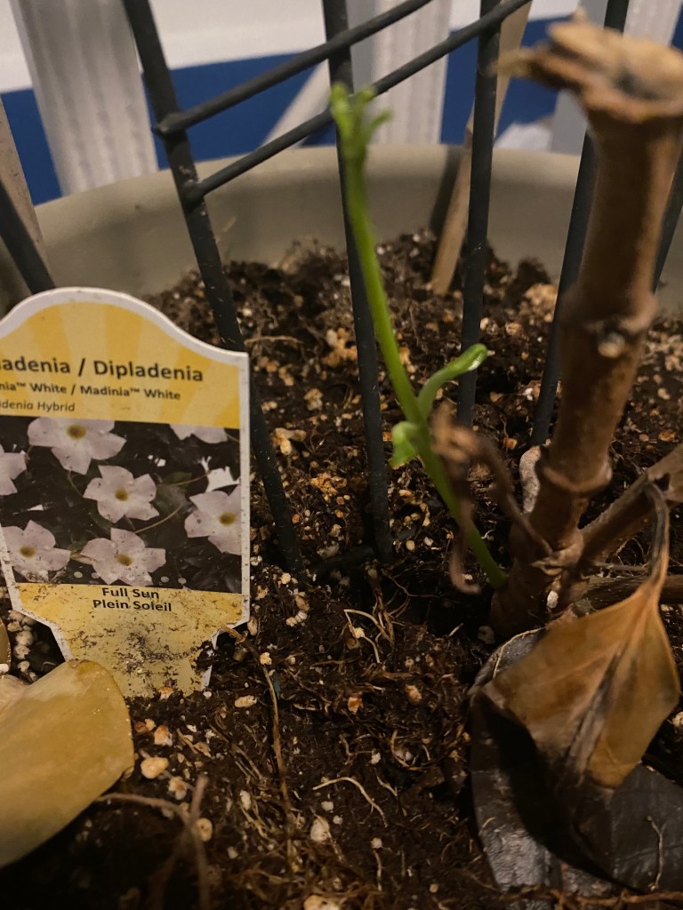 I have a Mandevilla plant that I absolutely love. I buy them every year and someone said I should bring it in as a houseplant. Well of course I procrastinated until the first frost and it just turned brown. But I had hope so I cut it down and brought it in. That was in September. I kept it watered. Added some plant food. Told it to please grow. And now here it is mid November and the first green shoot. If it didn’t grow, I would be okay. Hope is my ability to see the possibilities and accept the failures. Hope can lead to ecstatic joy. Failure leads to knowledge. Maybe there is this wonderful heaven place or maybe I just become part of the earth, but either way I’ll be happy.
